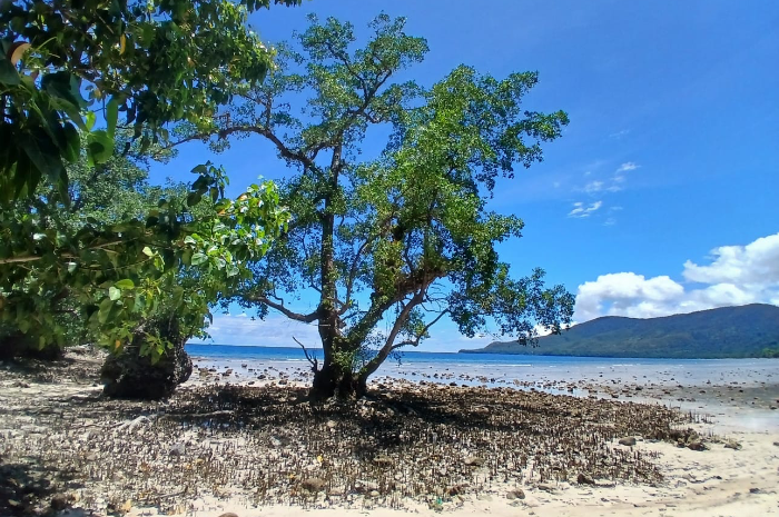 “Dulu pernah tanam ratusan anakan mangrove,” kenangnya. “Tapi tak satu pun hidup. Sekarang tinggal satu di belakang gereja. Kadang gugur daun, kadang tumbuh lagi.”