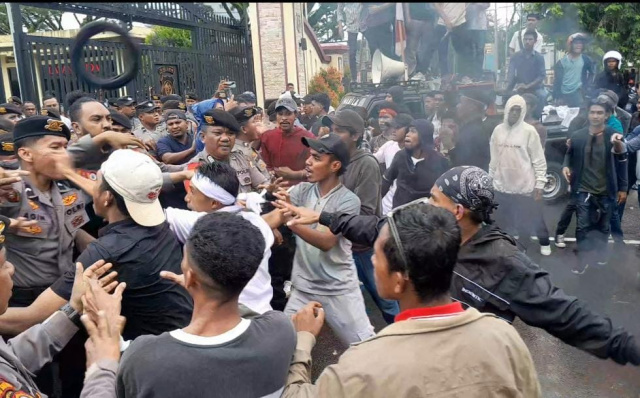 Pantauan potretmaluku.id, aksi yang semula berlangsung damai berubah menjadi ricuh setelah massa melempari polisi dengan ban motor bekas.